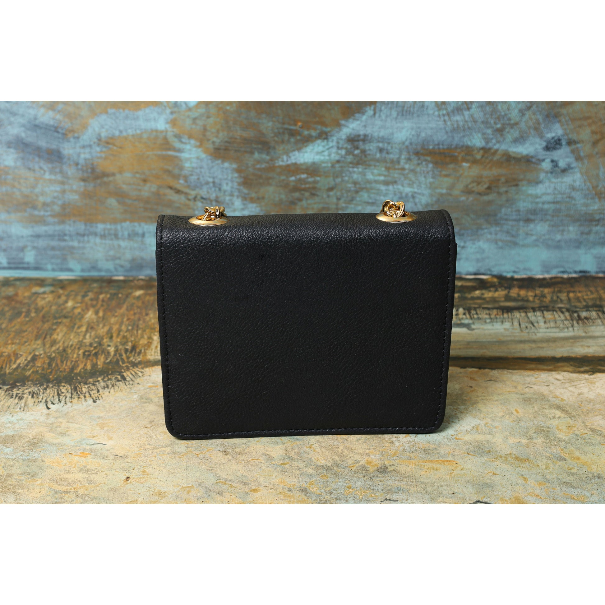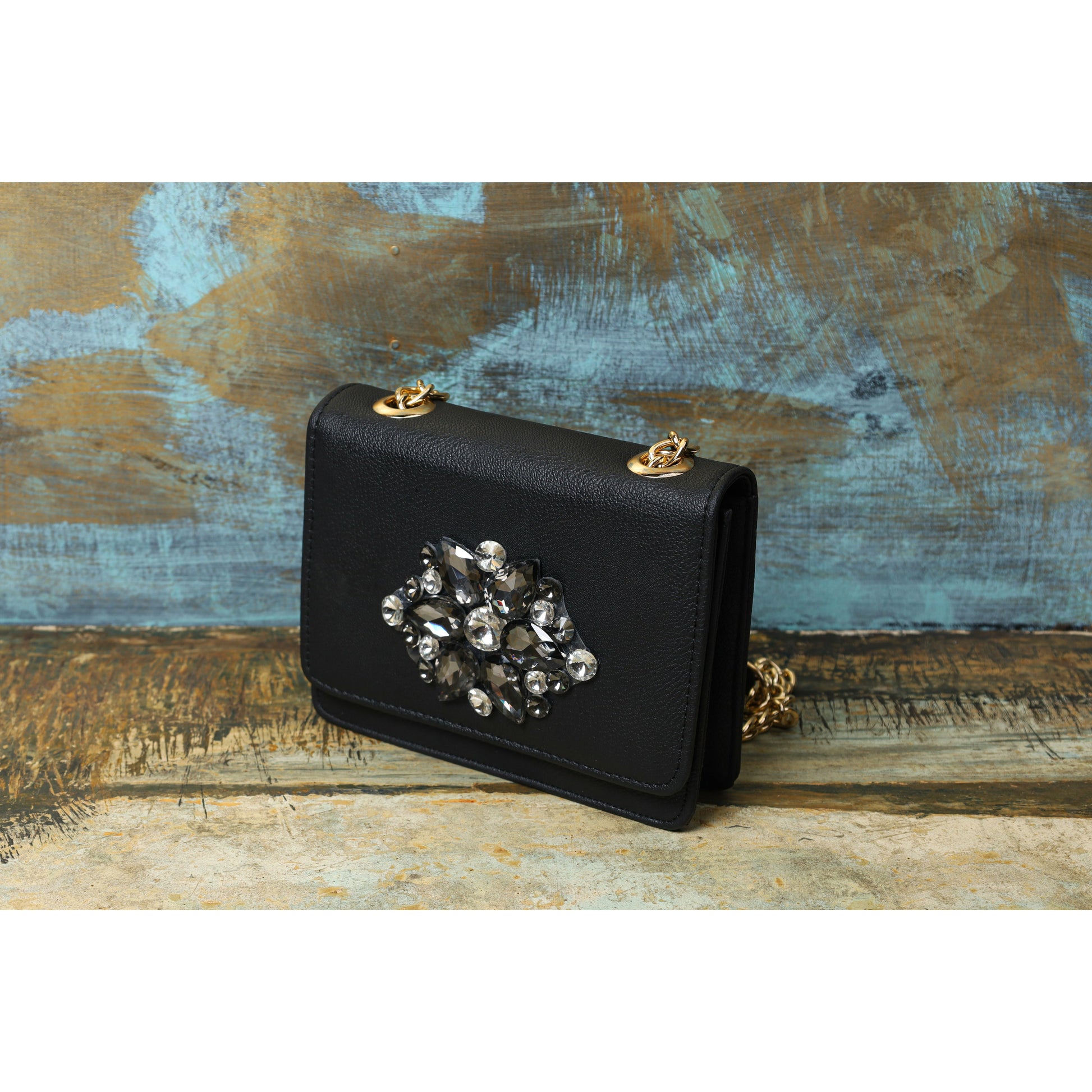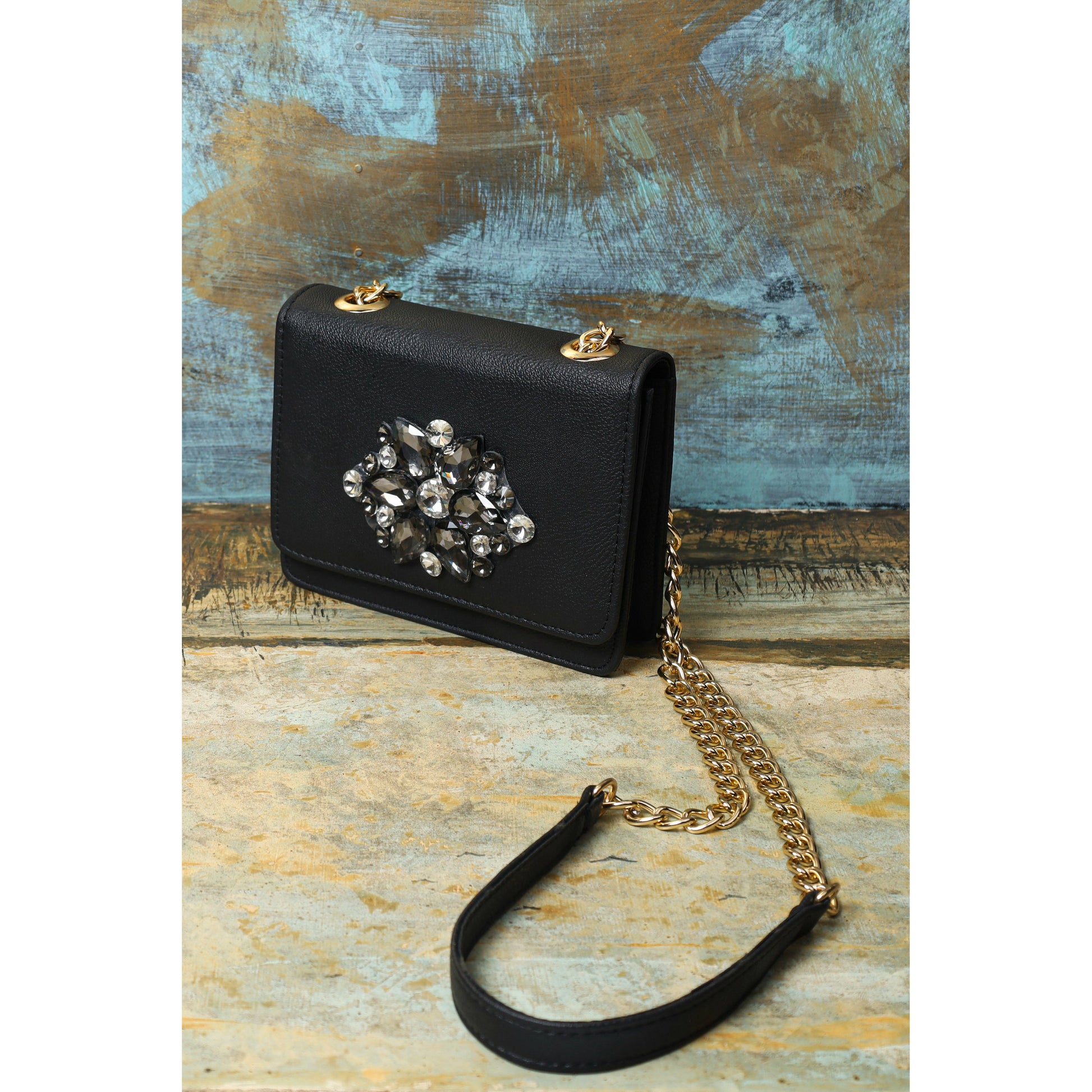 Gold chain embedded into beautifully crafted black bag. At the centre stage custom made rhinestone.