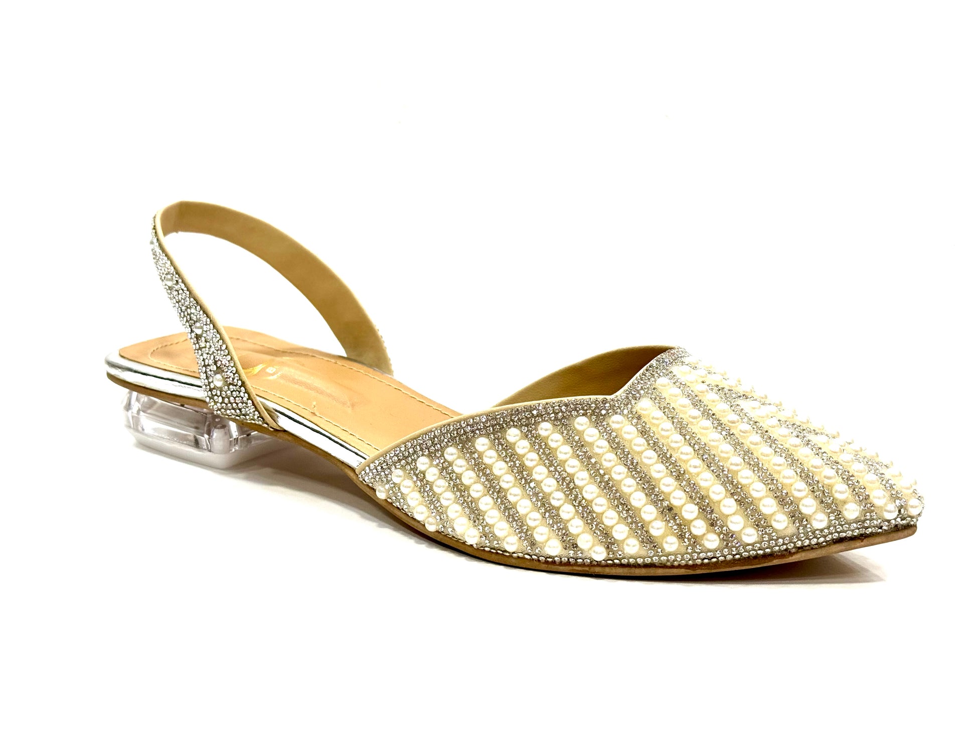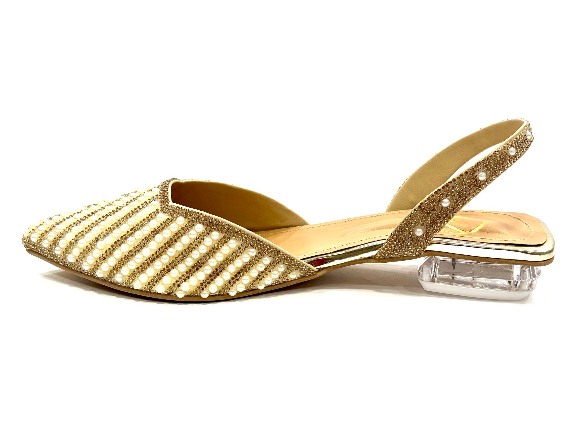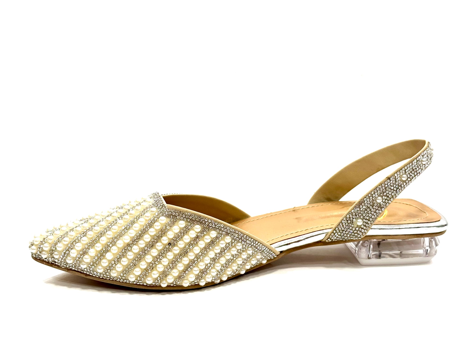 Half inch glass heel with pearls.