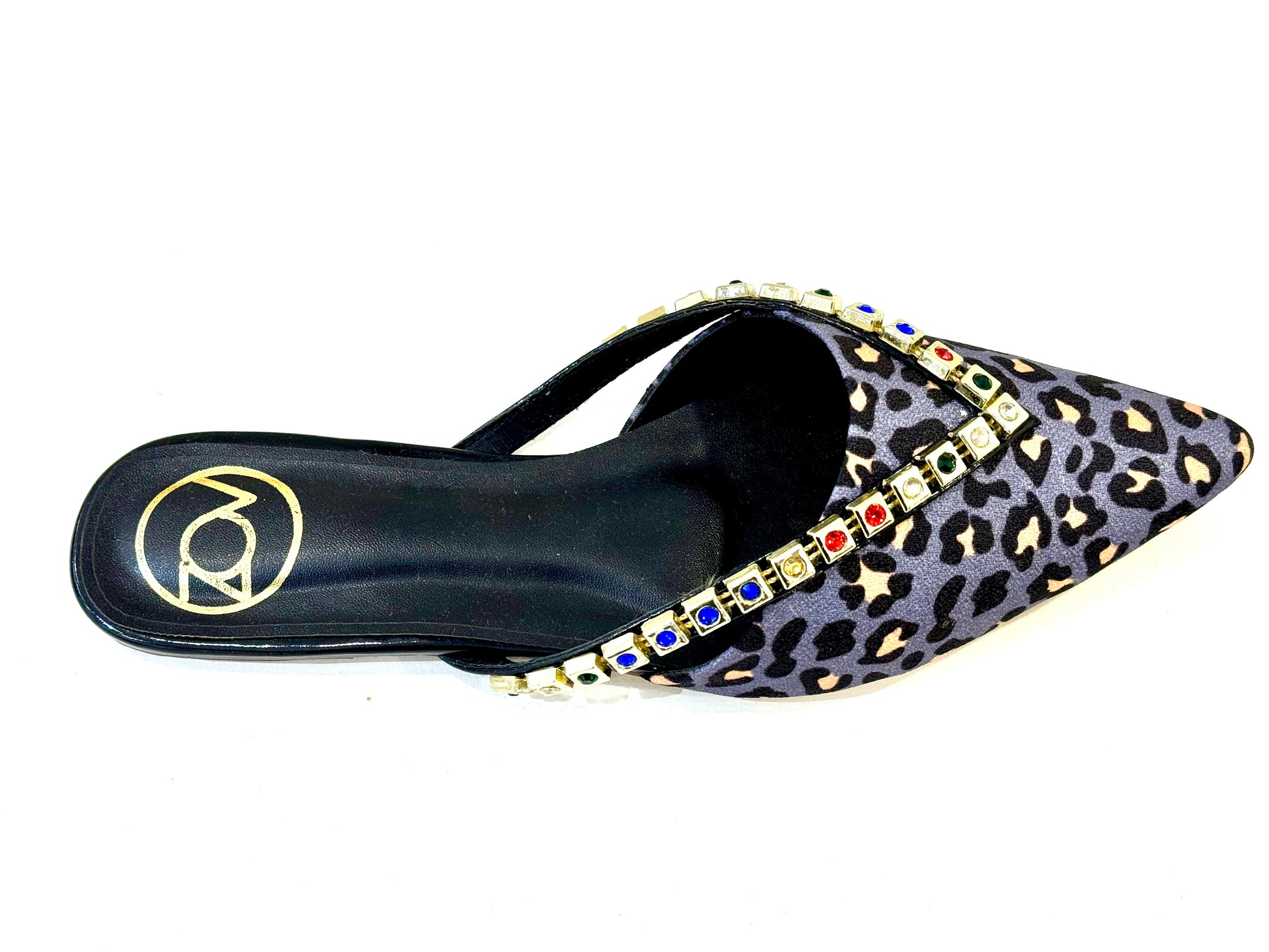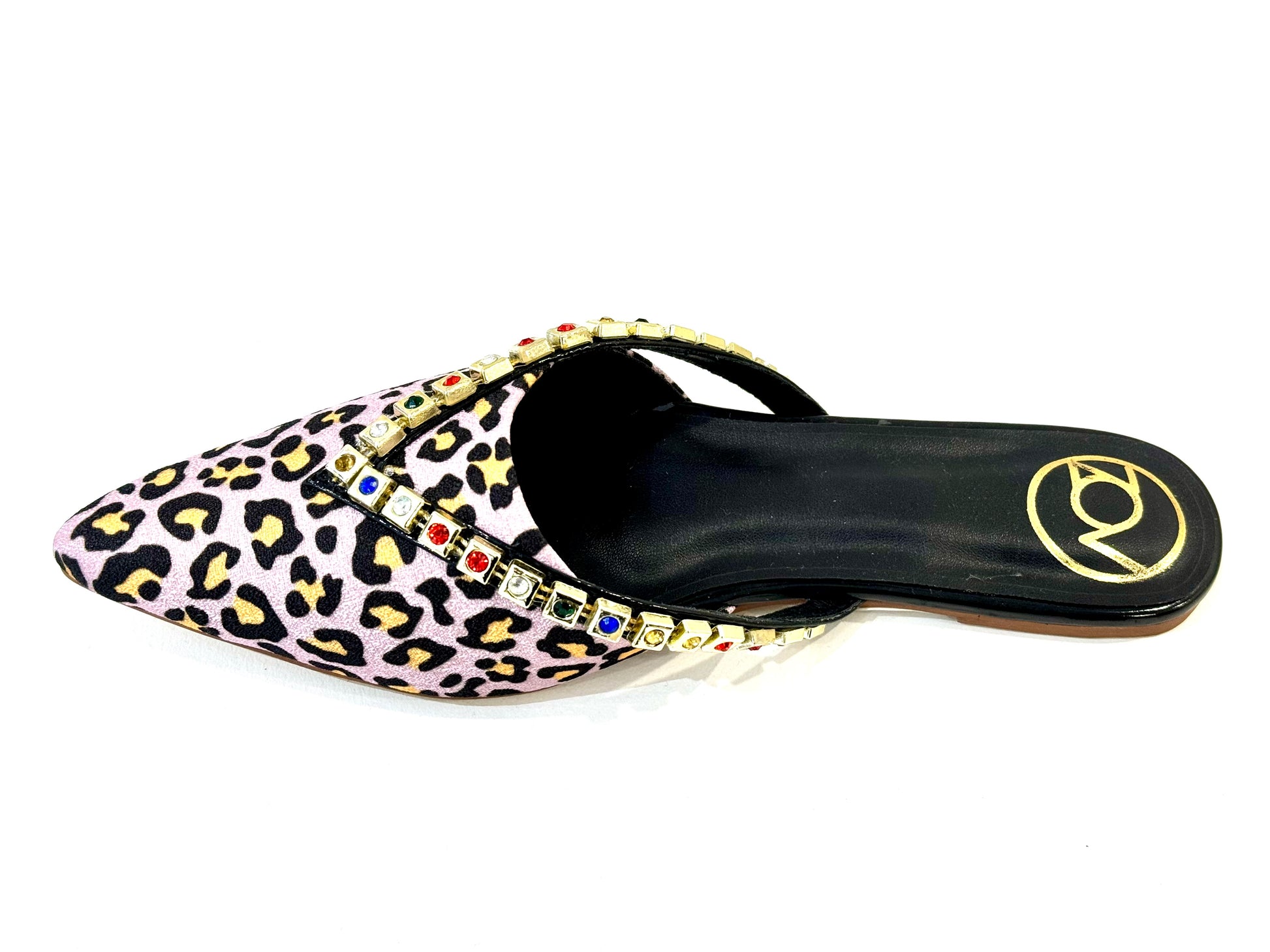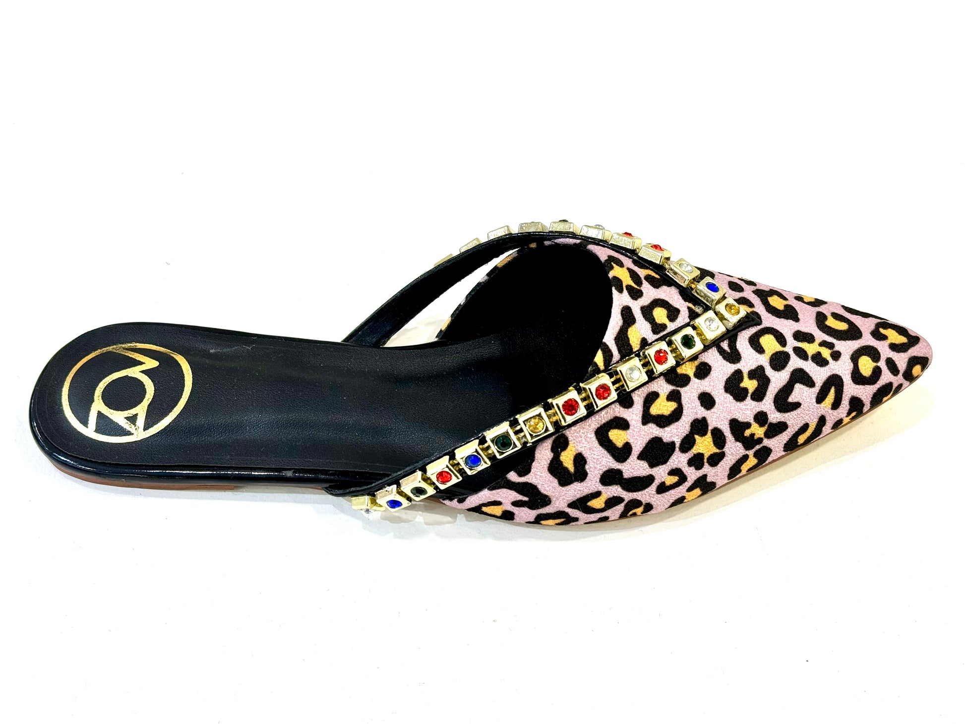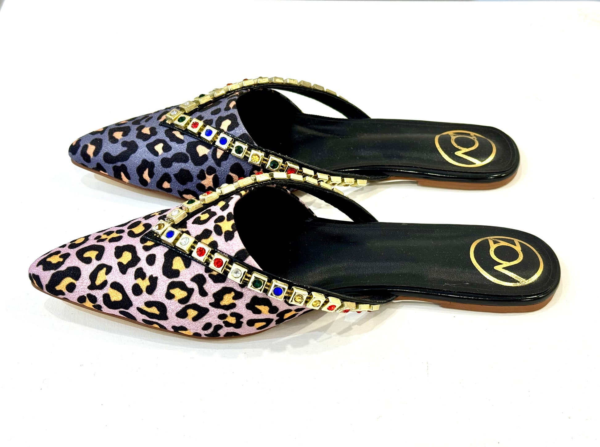 Combination of tiger print with fusion of colours. Rhinestone gold plated flats.