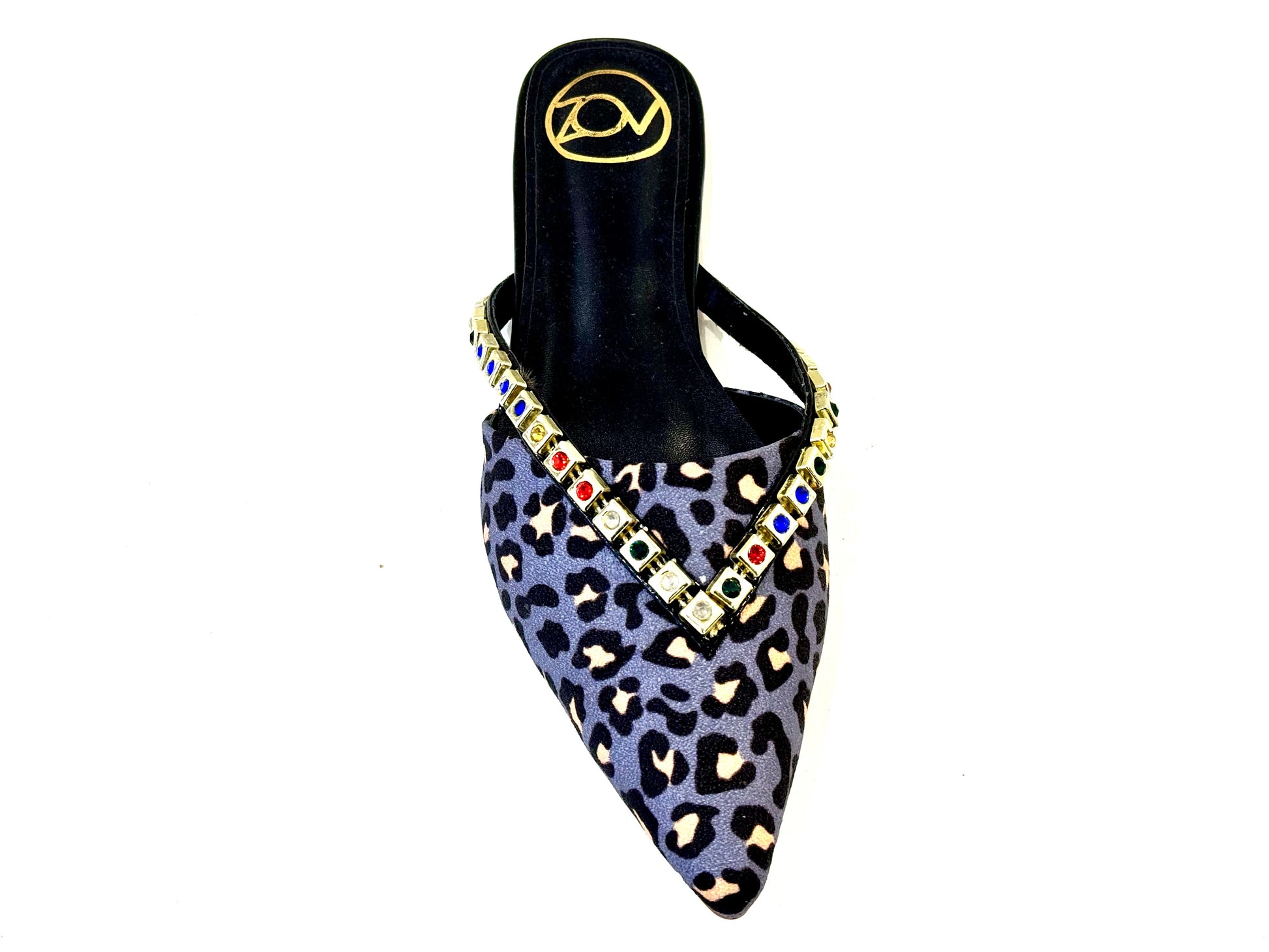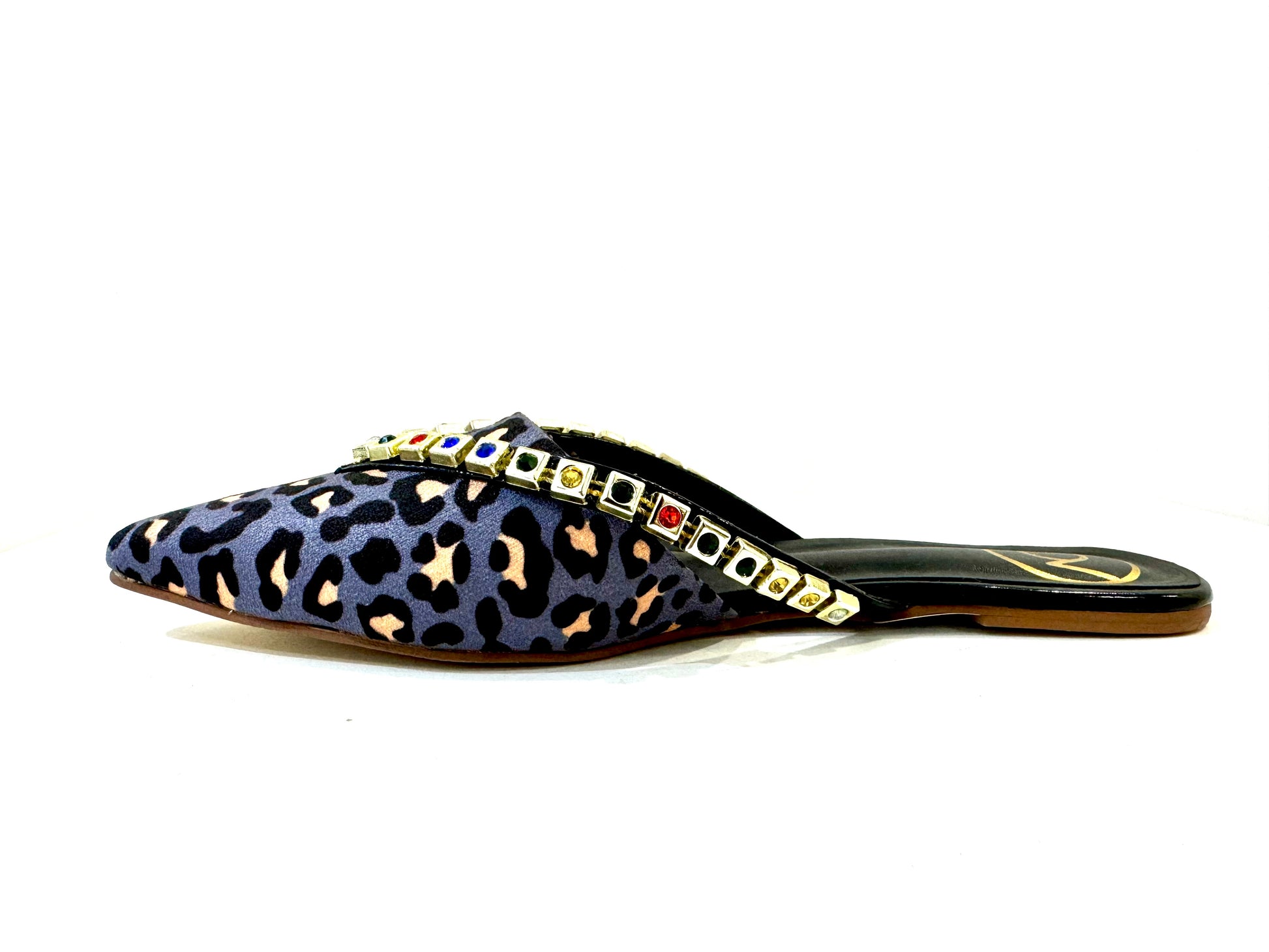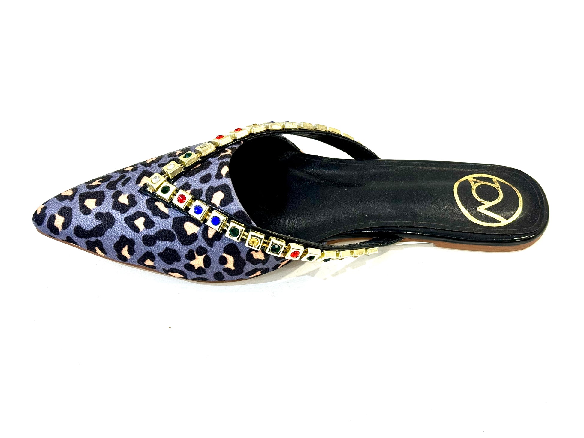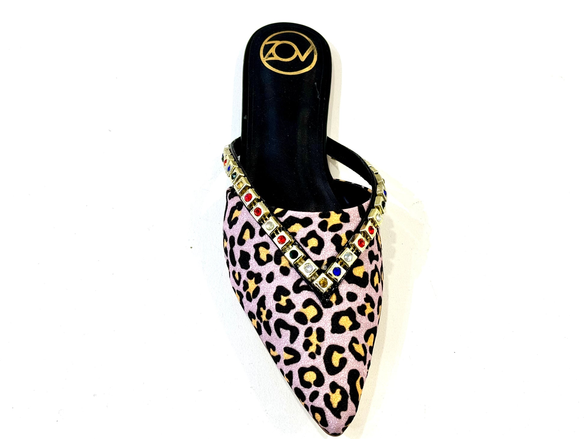 Combination of tiger print with fusion of colours. Rhinestone gold plated flats.